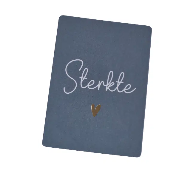 De kaart sterkte kan je versturen als iemand in je omgeving een moeilijk tijd doormaakt. Je kunt denken aan het verlies van een persoon, verlies van je gezondheid of een andere tegenslag in het leven. De boodschap is kort en bondig, op de achterkant kan je een persoonlijke tekst schrijven. Ontvanger(s) zullen het waarderen en voelen dat je met ze meeleeft en aan ze denkt. Ga je persoonlijk bij iemand langs in een moeilijke tijd dan is dit kaartje handig om aan een klein doosje chocolade of andere attentie te hangen.