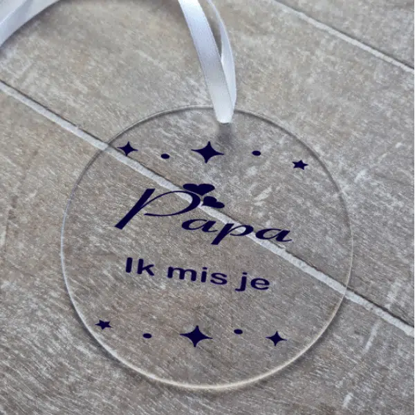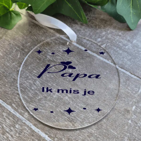 Deze troosthanger met tekst papa, ik mis je past prachtig bij een krachtplekje, aan een koesterplankje of als hanger om subtiel aan een tak of bloem te hangen.